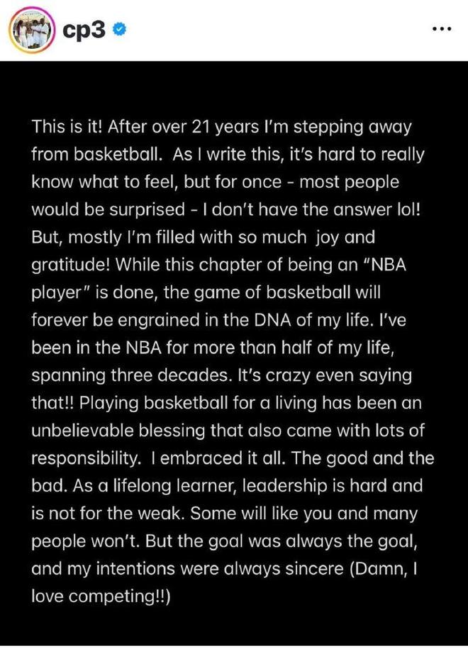 就這樣,在經(jīng)歷超過21年NBA生涯后,我將告別籃球生涯。當(dāng)我寫下這些文字,我確實很難真正去體會內(nèi)心情感,但這一次大多數(shù)人可能會感到驚訝,對此我并沒有答案。
