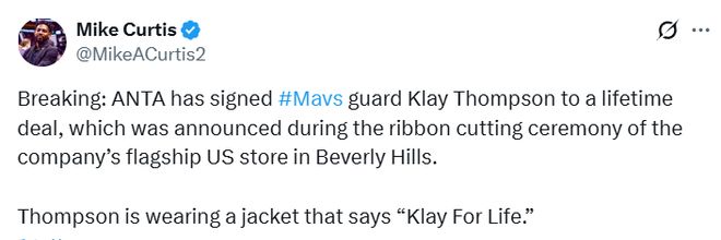 離開金州勇士、告別冠軍搭檔庫里后,他一度處境艱難,但如今在達(dá)拉斯找到了新歸宿。賽場內(nèi)外都蒸蒸日上:庫珀-弗拉格新秀賽季便驚艷世界,而克萊與說唱歌手梅根-西-斯塔里昂的戀情曝光,也讓這位神射手一夜之間成為八卦媒體焦點(diǎn)?,F(xiàn)在,克萊又多了一個開心的理由——他在洛杉磯全明星周末上,正式宣布與安踏簽下終身球鞋合約。