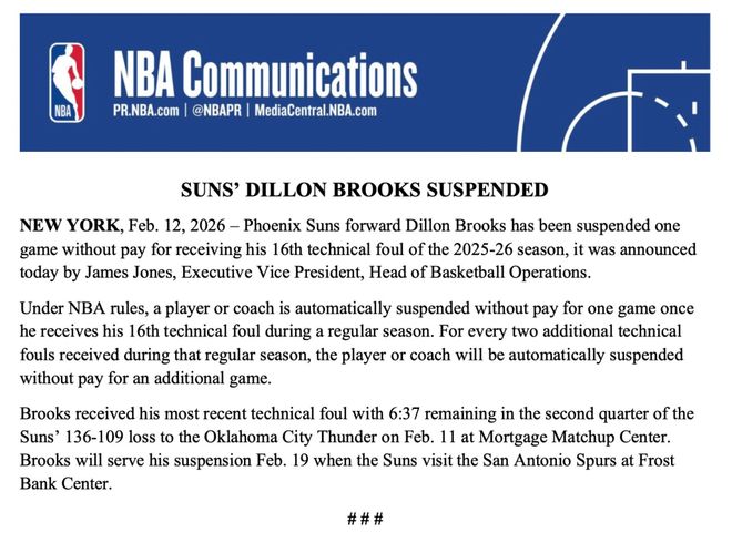 北京時(shí)間2月13日,據(jù)聯(lián)盟官方消息,太陽前鋒狄龍-布魯克斯因領(lǐng)到個(gè)人本賽季第16次技術(shù)犯規(guī),被處以禁賽一場、無薪處罰。狄龍將損失121,403美元的薪水。這筆錢是他21,124,110美元年薪的1/174。太陽隊(duì)將獲得50%的薪資稅差額抵免。