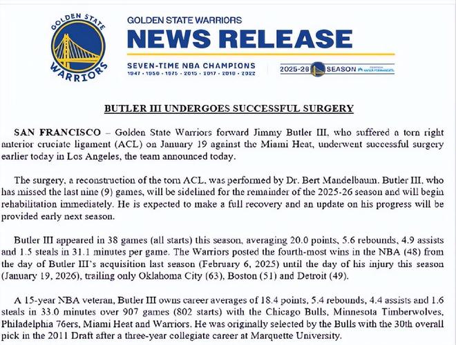 手術(shù)由伯特-曼德爾鮑姆醫(yī)生主刀,對撕裂的ACL進行了重建。巴特勒已缺席過去9場比賽,將缺席2025-26賽季剩余所有比賽,并立即開始康復(fù)治療。預(yù)計他將完全康復(fù),下賽季初會提供最新恢復(fù)進展。